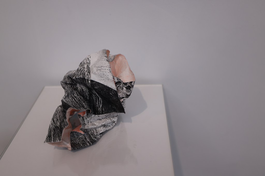 Joy and Eleanor find common ground in their exploration of inhabiting space, the traces that we leave behind and the encounters that leave their mark on us. Gather explores the often unspoken or unacknowledged aspects of inhabiting a female body and its relationship to water and the environment. Raindrops collecting, gathering, expanding and leaking, reflected in the meandering, rippling journey of the paper, suspended as if it were fluid trapped in pools, constrained, until it overwhelms and continues on its way.