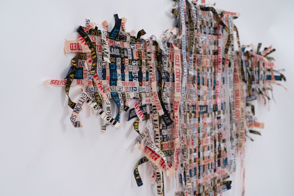 Georgina’s work explores autobiographical influences from childhood,the family and how we account for memories and stories. Her work has a significant relationship with words and writing; narratives appear in fragments of text woven into fabric and scratched into the surface of metal. She is interested in the ways that language can reveal and liberate, but also how it can betray you. Words can be slippery and untrustworthy, they can honour a narrative or discredit it. By using school name labels as a narrative tool to weave with, she unravels the complexities of familial relationships, the passage of time and how our personal and collective histories continue to shape us as adults.