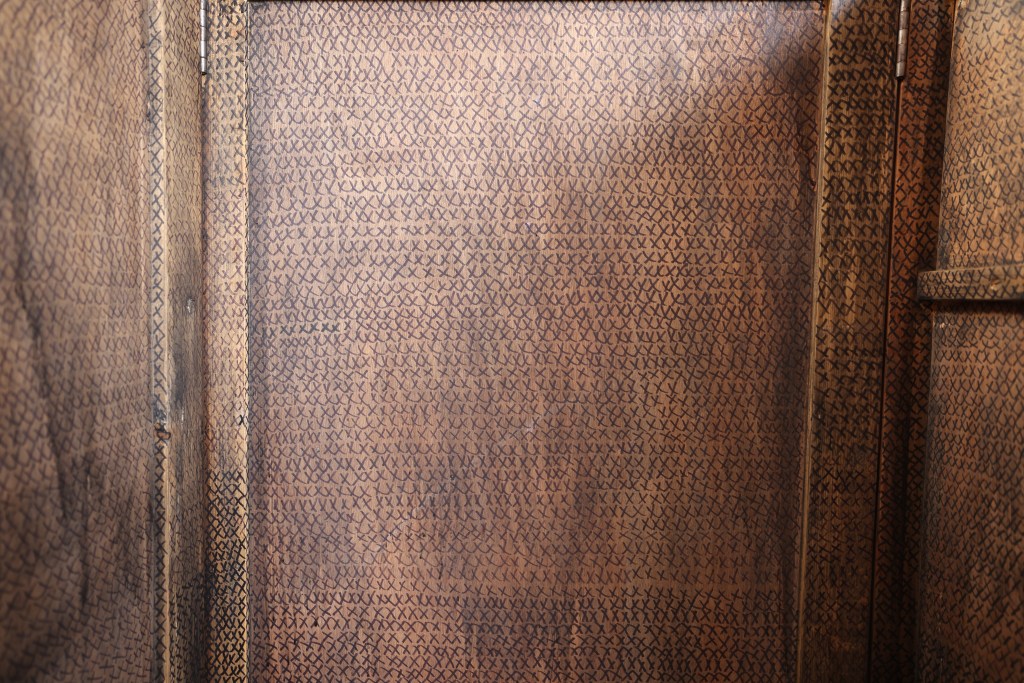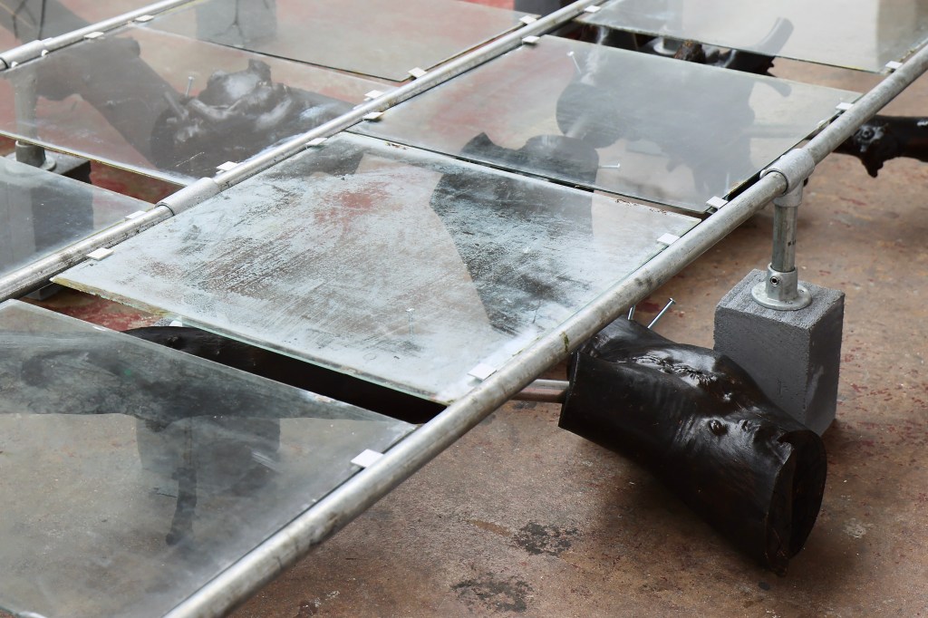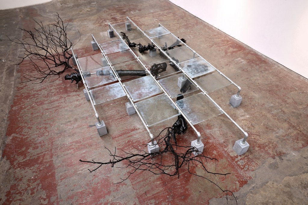 In Slowly, Extinction, Nele deconstructs the greenhouse into a single plane, reflecting on their history of rupture. Greenhouses manipulate heat, humidity, and airflow to sustain plants, often from other cultures. In doing so, these plants are situated as fragile beings in need of nurturing. Te responds to Nele’s greenhouse as a mechanism that can imitate a diversity of environments, and characteristically, amplifies heat. Underneath the glass, Te positions heat-treated Plane tree sections as a simulacra for the Southern Utah desert environment, its fauna in a state of slow death under a barely tolerable sun.