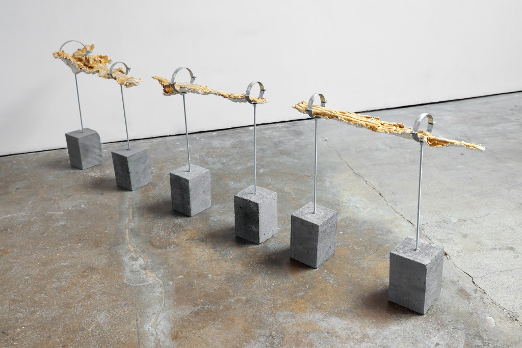 Working in collaboration for the first time, Nele and Te bring together their research on material, recontextualization, and landscape (specifically solar farms, greenhouses, the desert, excavation sites). For each installation, the artists work using a communicative two-step method, with one responding to the sculpture that the other provides.