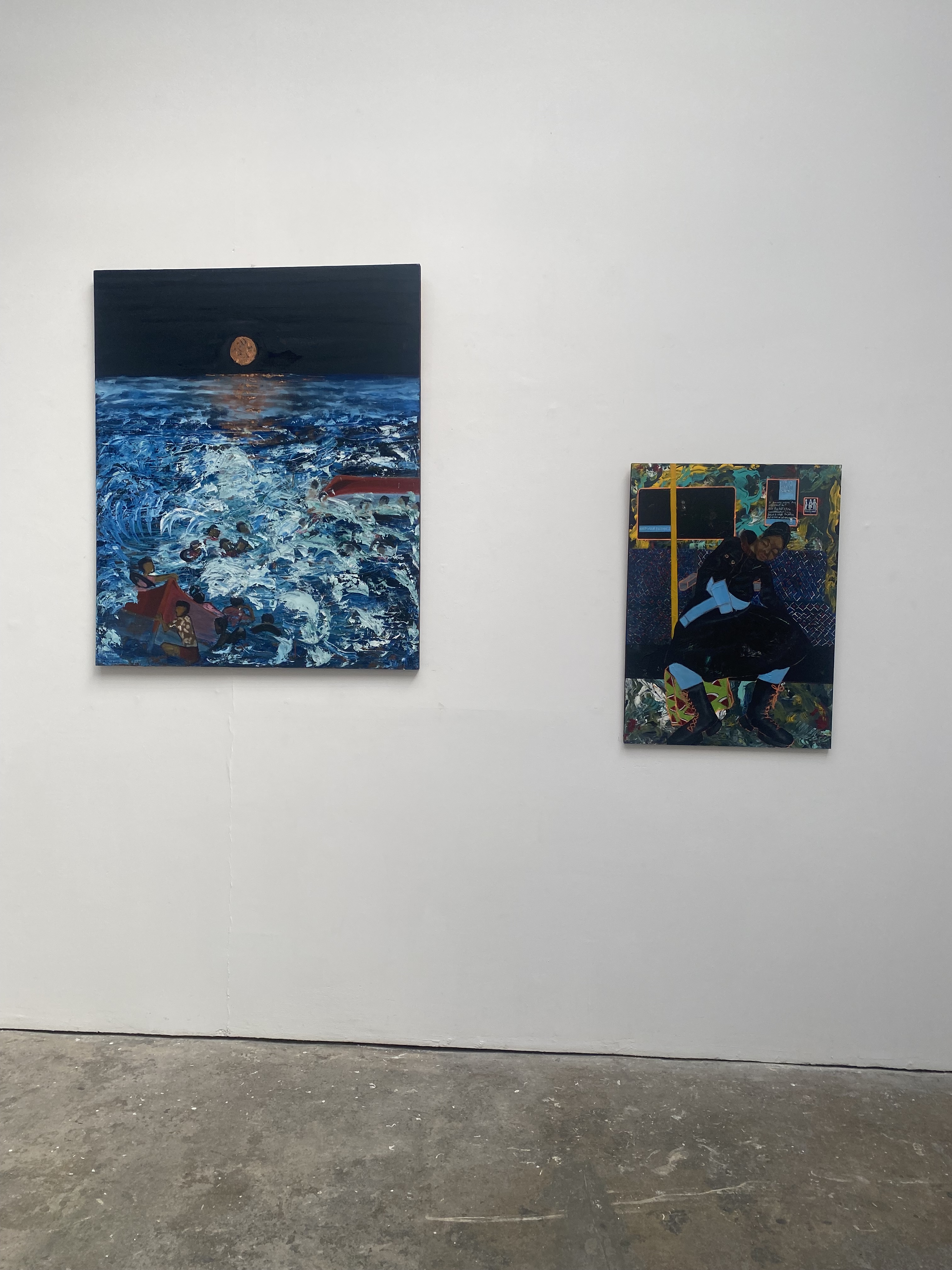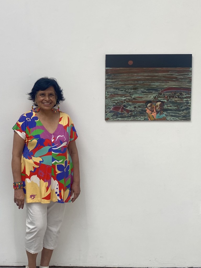 Nimmi’s work addresses both political and social issues. In ’The Big Issue’ she portrays a rough sleeper spending her night on the London underground. In ‘Stop the Boats?!’ she questions the wisdom of Rishi Sunak’s immigration policy and action. She also makes pen and ink paintings which look at the burnout created by work schedules that exist within capitalistic societal structures.