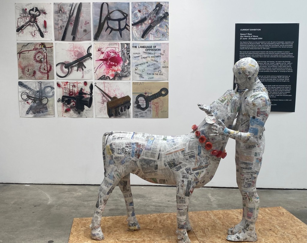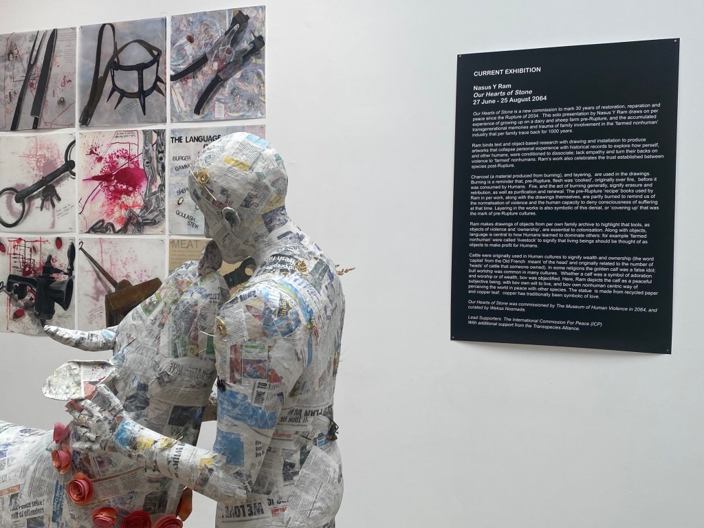 Nasus Y Ram’s work is commissioned by the Museum of Human violence to commemorate 30 years of peace since 2034, and to record and remember the violence to farmed nonhumans before the Rupture. Ram accesses per family’s long history, (pre-rupture) of involvement in the farmed nonhuman industry. Hum draws tools from per own family archive that indicate the cruelty involved in food production. Hum also deconstructs vocabulary that would have been familiar at that time, to point to how violence was normalised through language. The sculpture is made from recycled paper; it counters the violence inherent in the images, and rejoices in the new understandings between species that we have now achieved.