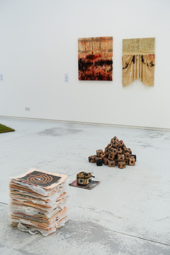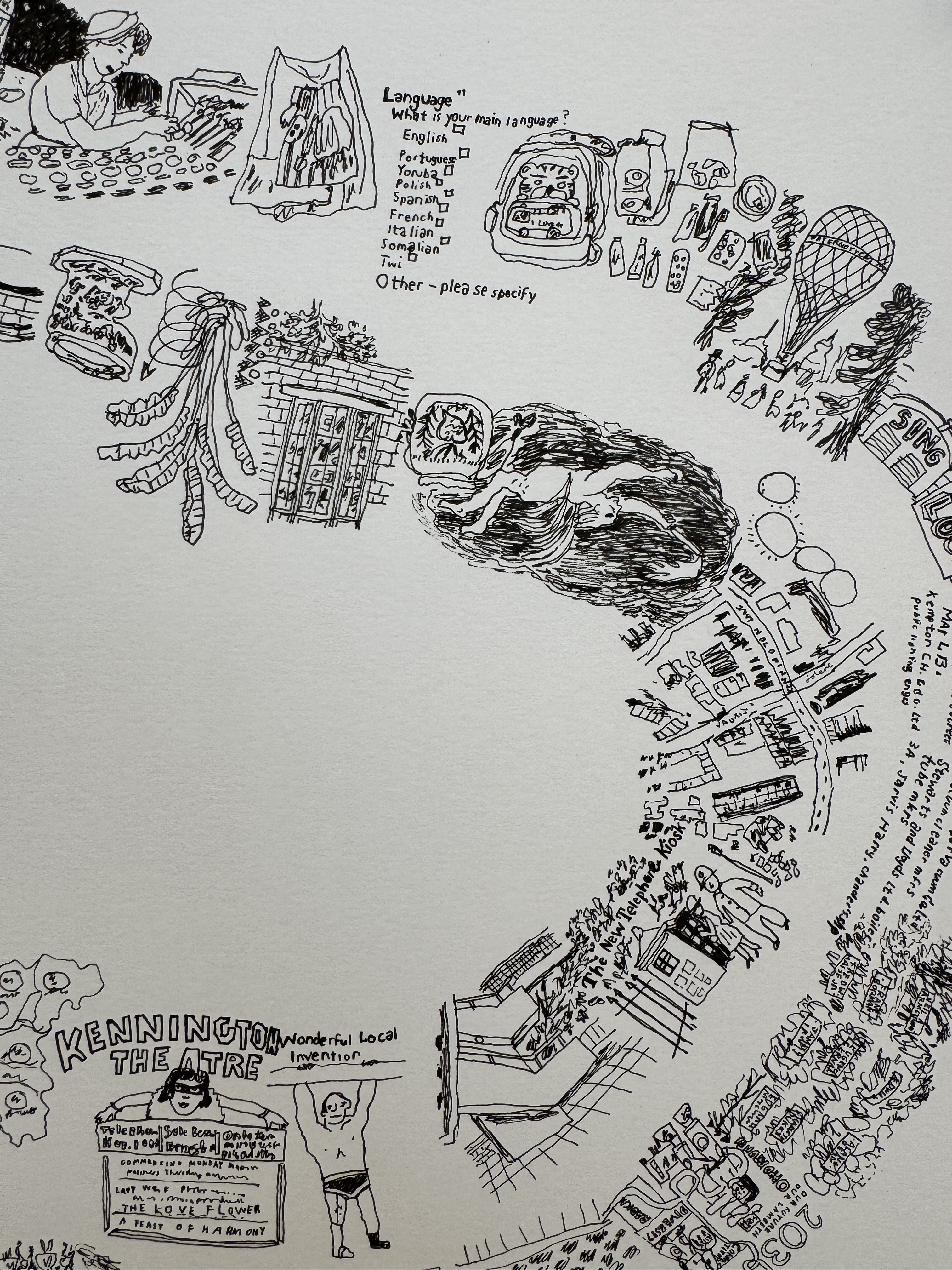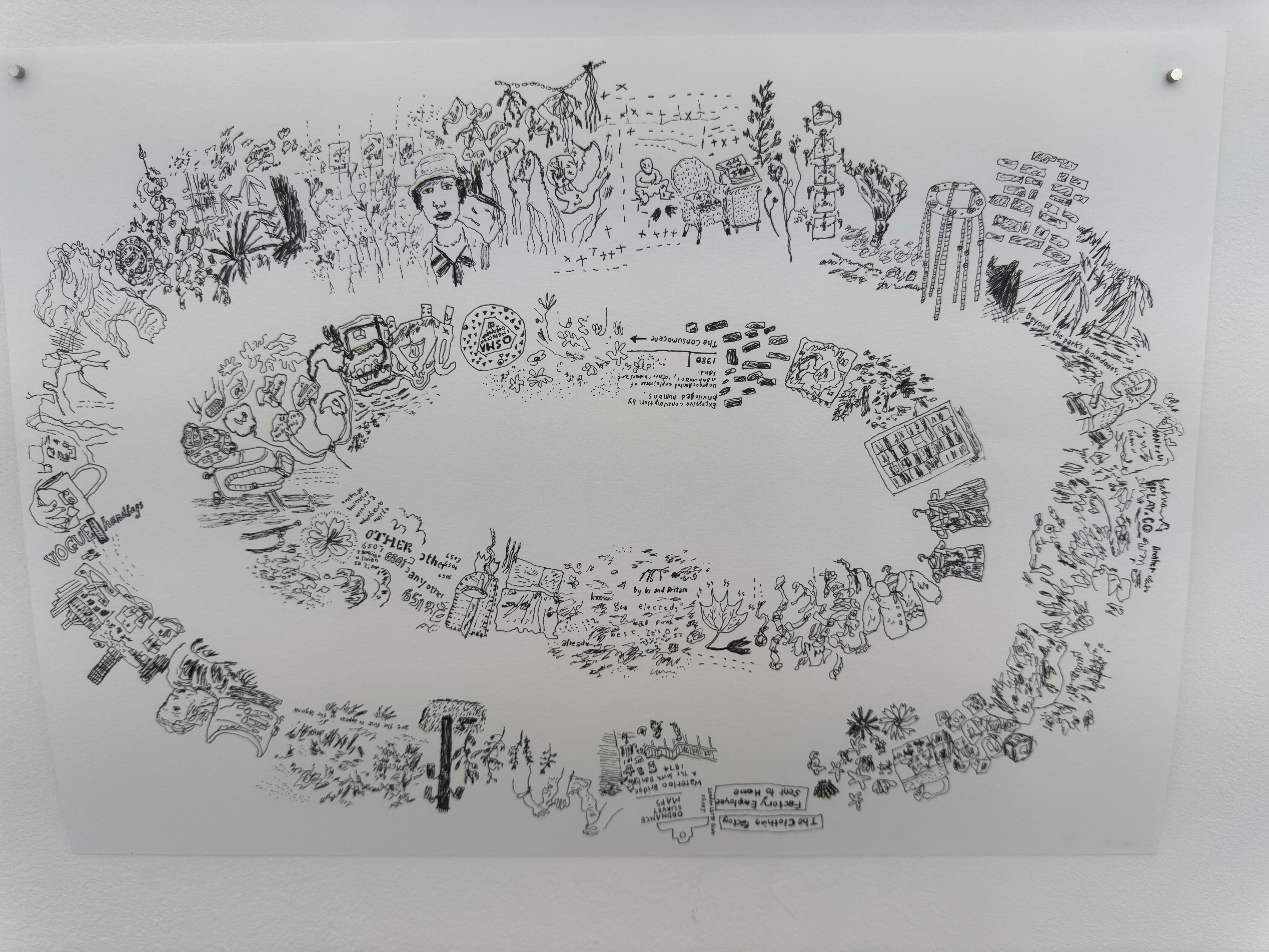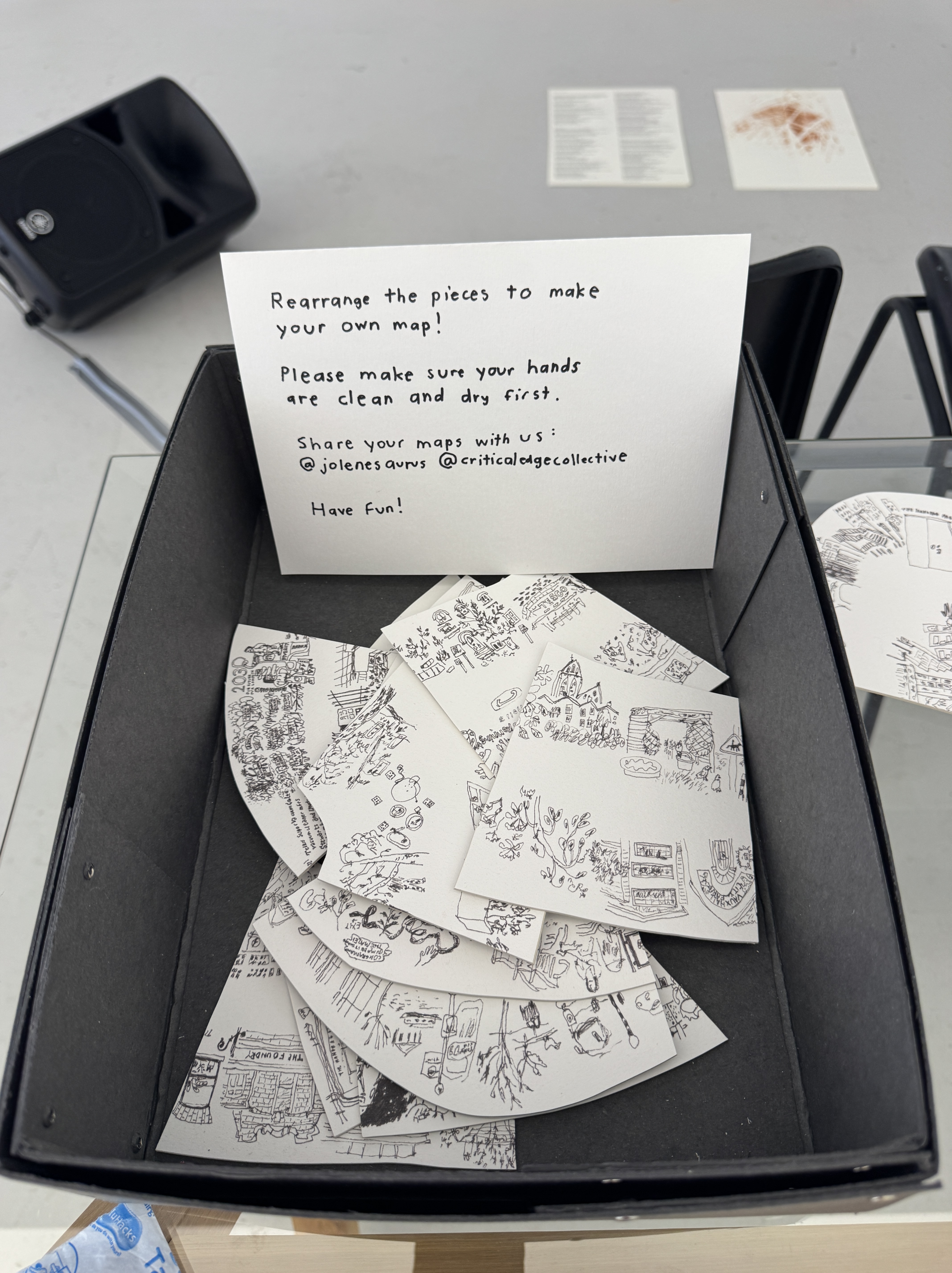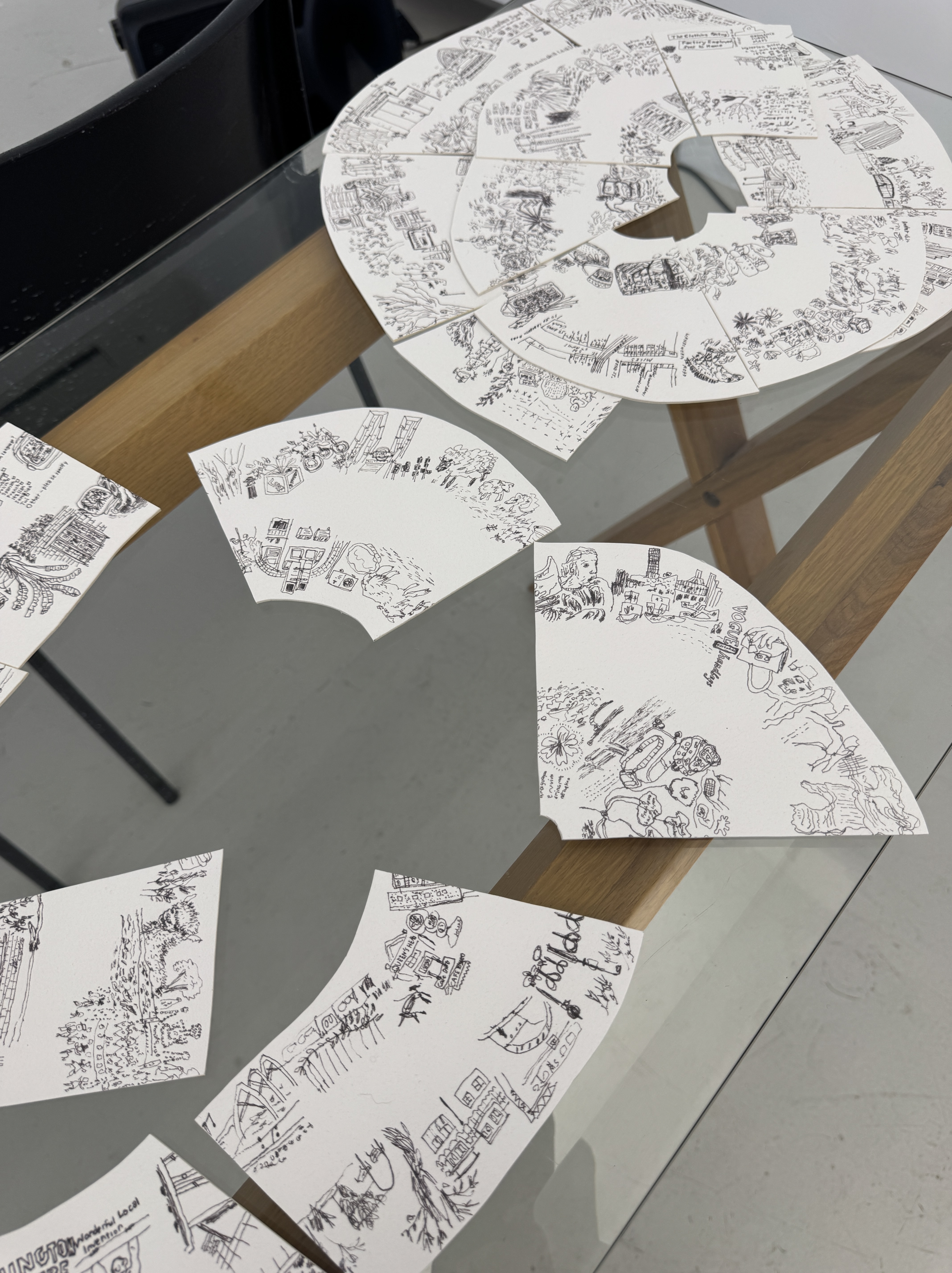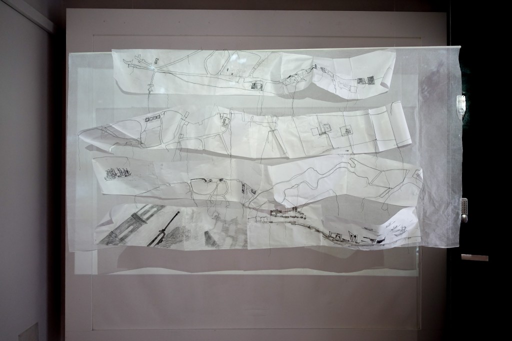 An interactive work that invites visitors – no longer just viewers but co-creators – to rearrange these map fragments and make their own imagined journeys. The original drawings are walking maps of the area around The Handbag Factory that Jolene made in the last few months, including one of the exhibition itself. The repeated process of rearrangement mirrors the ever-changing nature of places and spaces around us, and how the way we perceive or remember them also shifts over time. This is also an opportunity to reinterpret the exhibition in a new way, thinking about how it has been curated and taking ownership of what is presented to us, illustrating how the same objects and spaces can be seen from many different points of view.