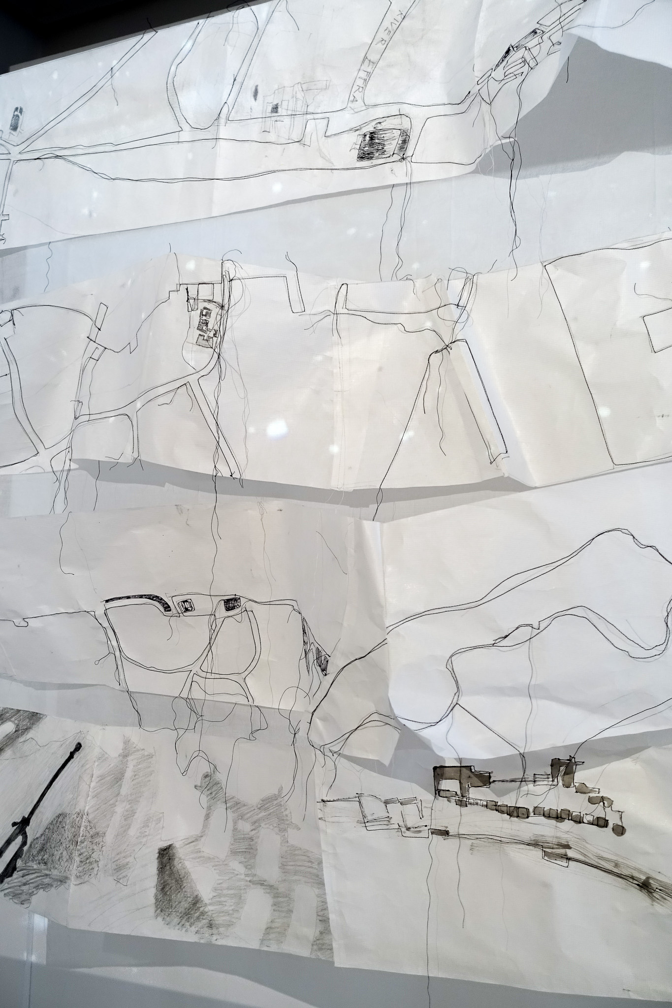 graphite, ink and stitch on hosho paper and lens tissue; film, 200 x 150cm