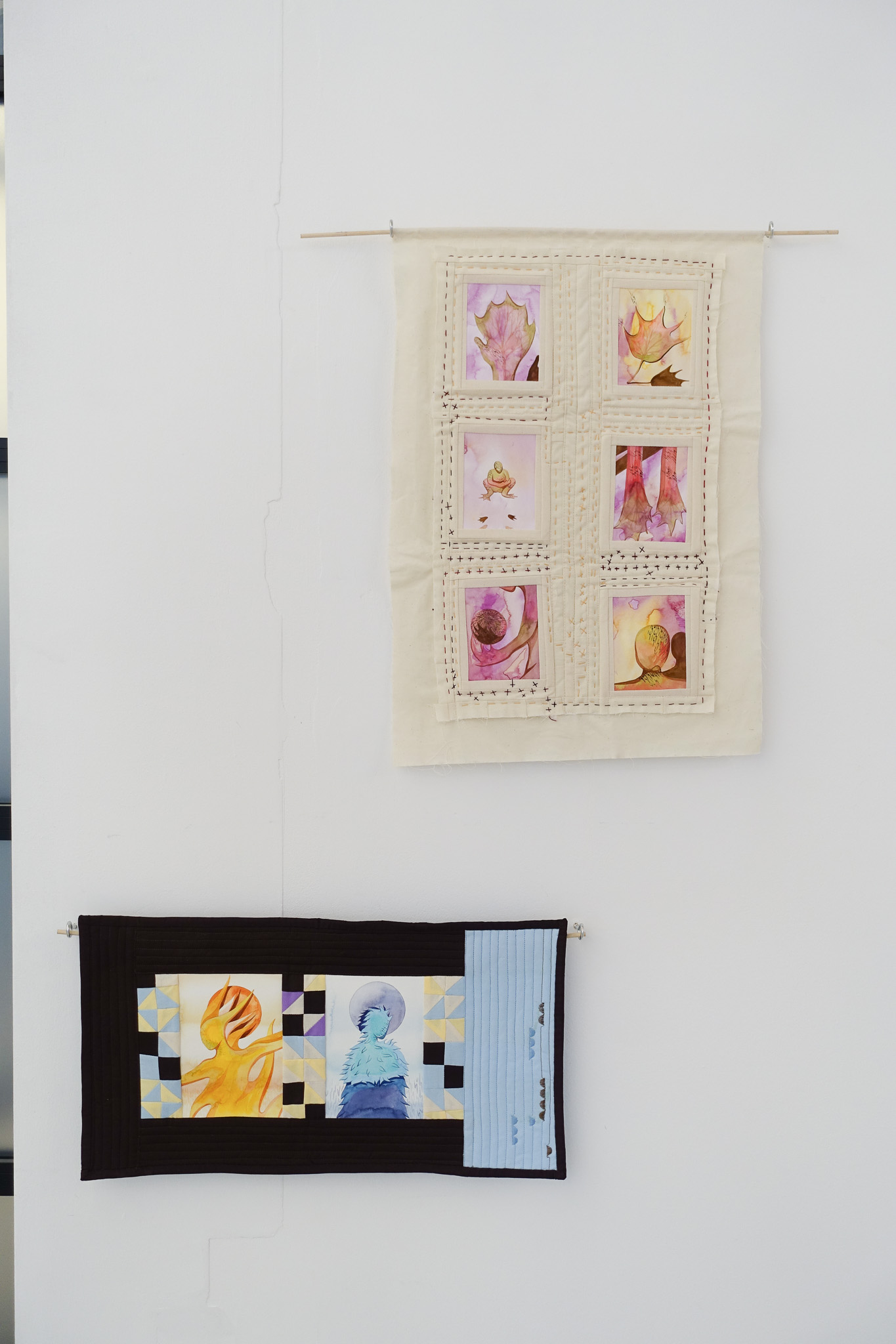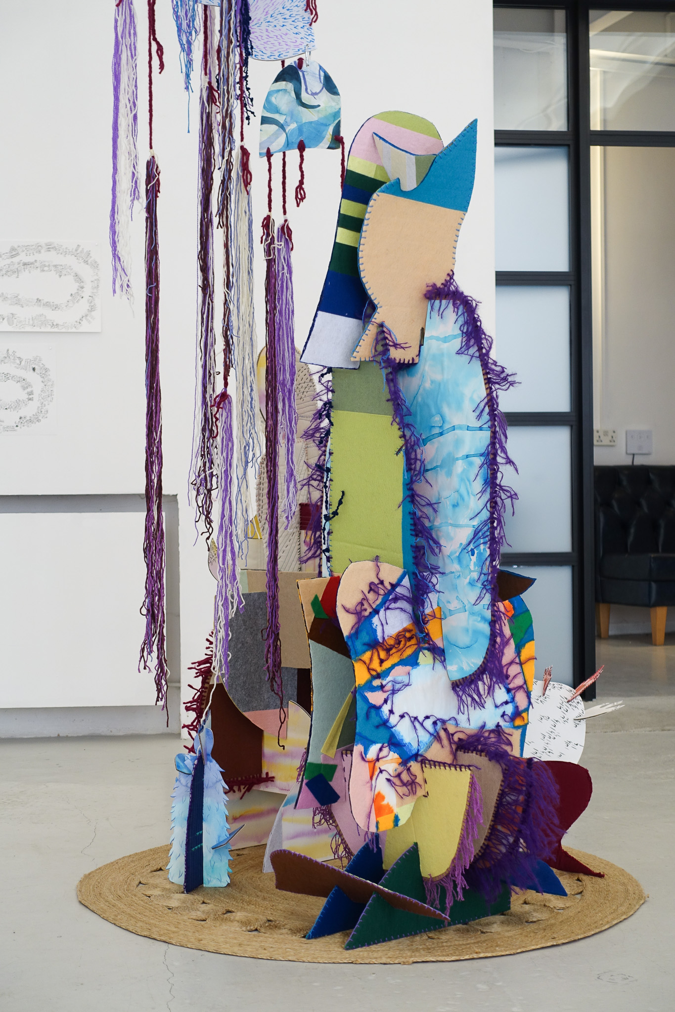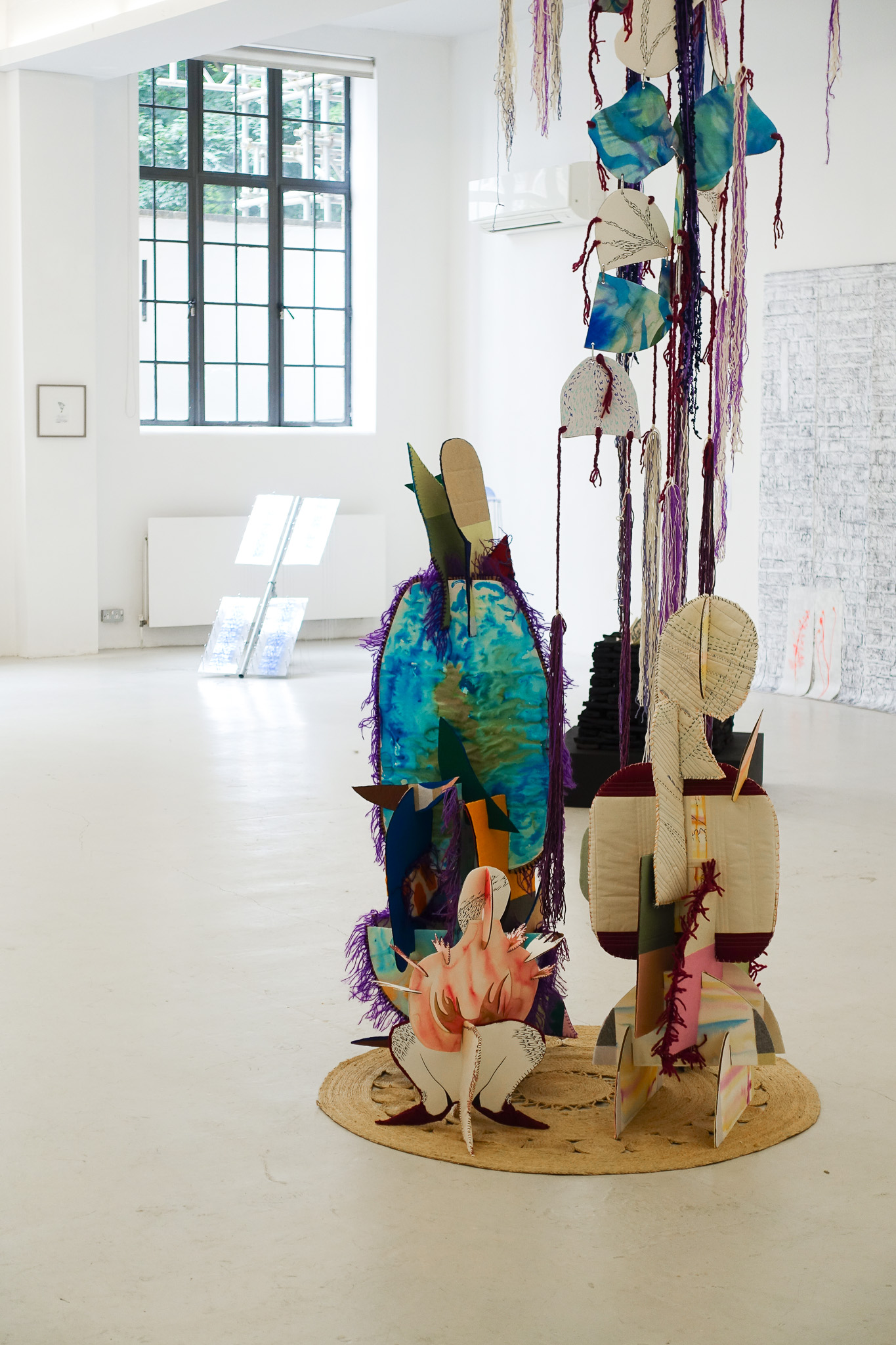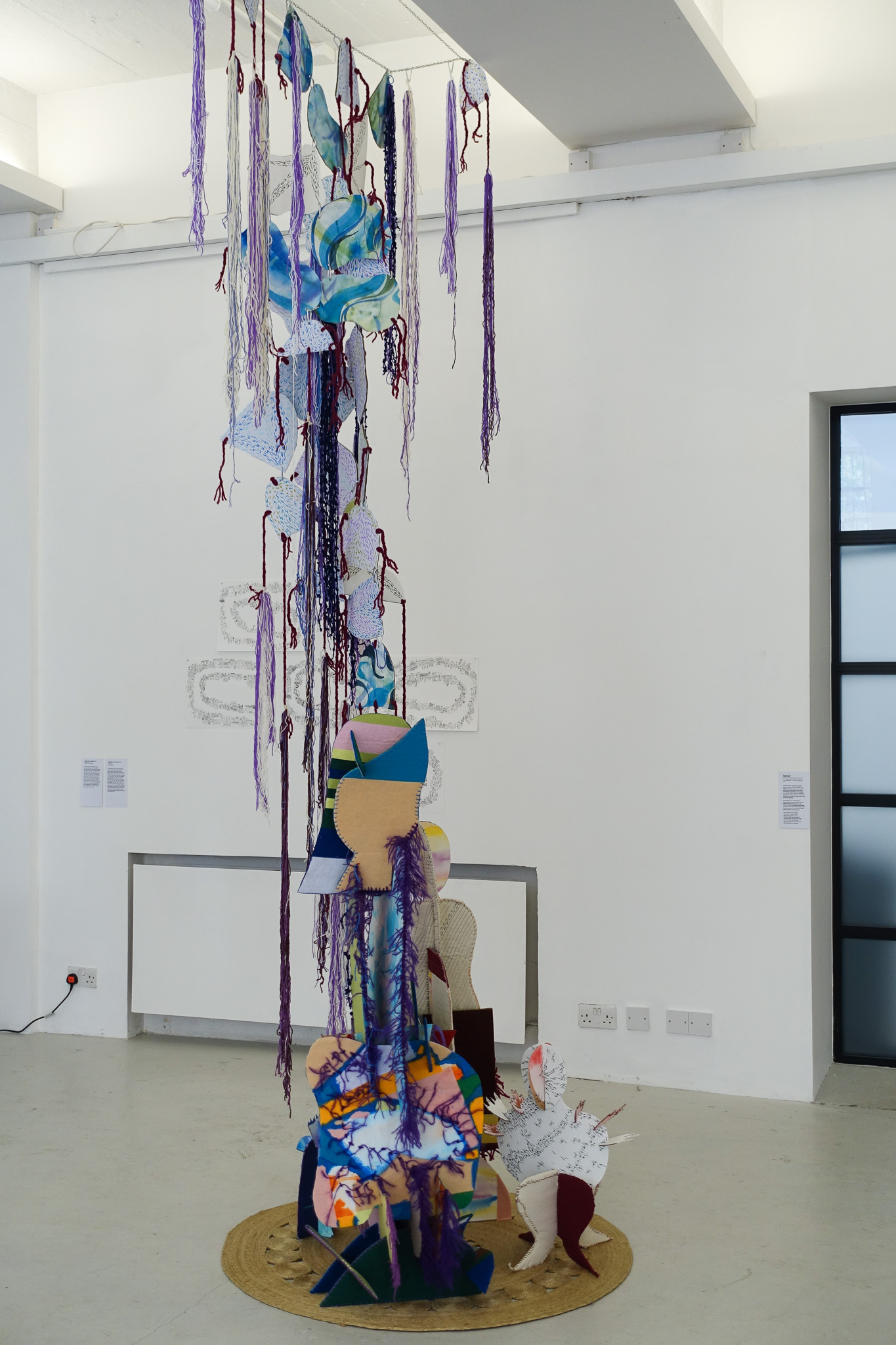 mixed media textile, paper and watercolour, 111 x 130cm sculpture; 60 x 42cm & 55 x 30cm wall pieces; 110 x 60cm suspended piece