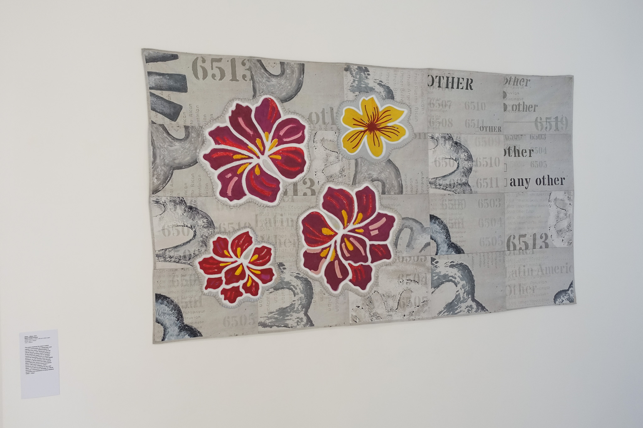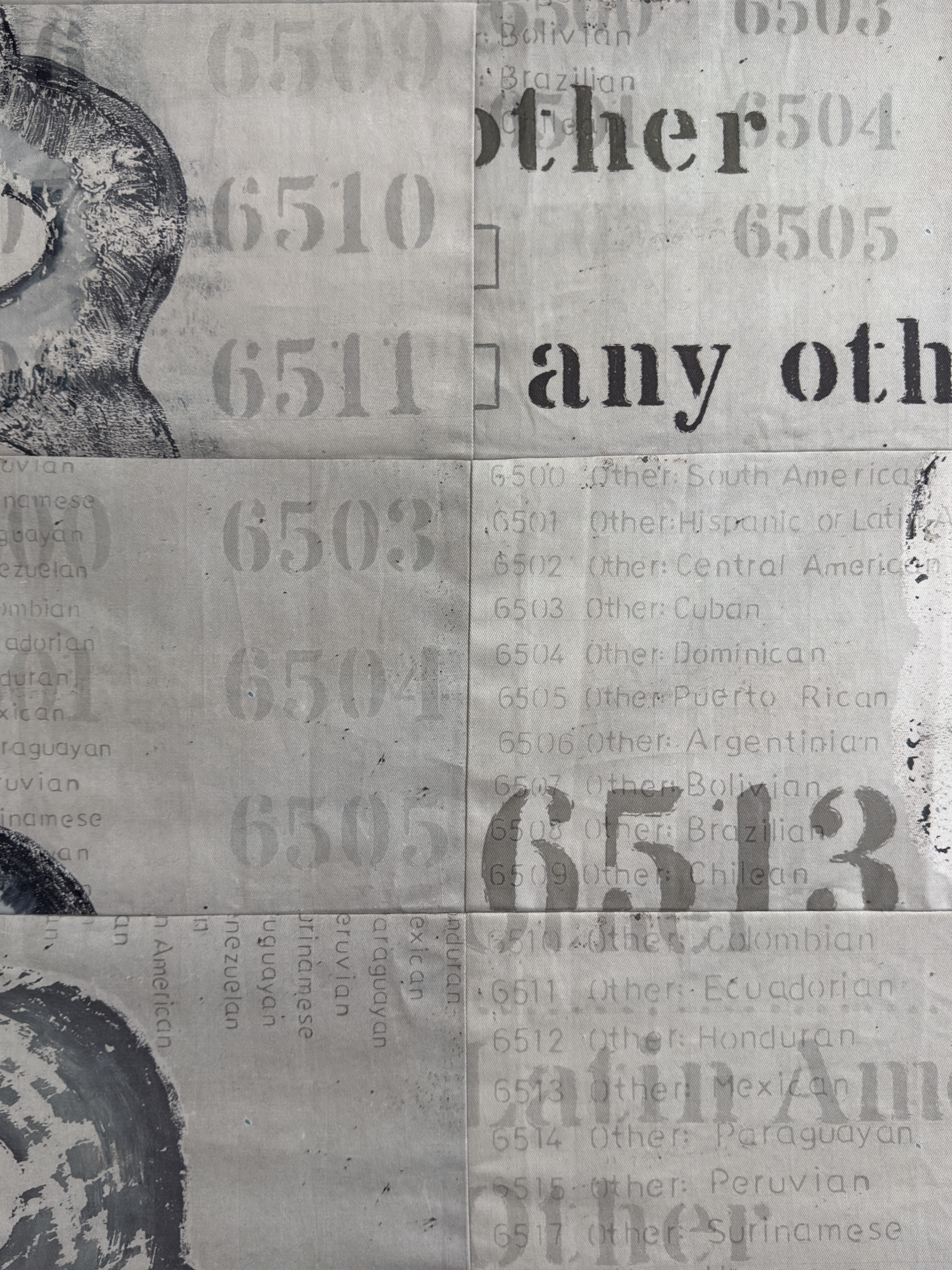 This piece explores the ways in which migrant communities are categorised, and how they are made visible/invisible by official records. Latin Americans are one of the fastest growing migrant groups in London and the largest one in Lambeth, where the Handbag Factory is situated. However, up until recently, they were largely invisible in official statistics and records. When filling the census and other official forms, Latin Americans found themselves having to tick the category ‘Other – Other’. This piece is inspired by the Latin American community’s campaign for official recognition and resistance to being rendered ‘Other – Other’.