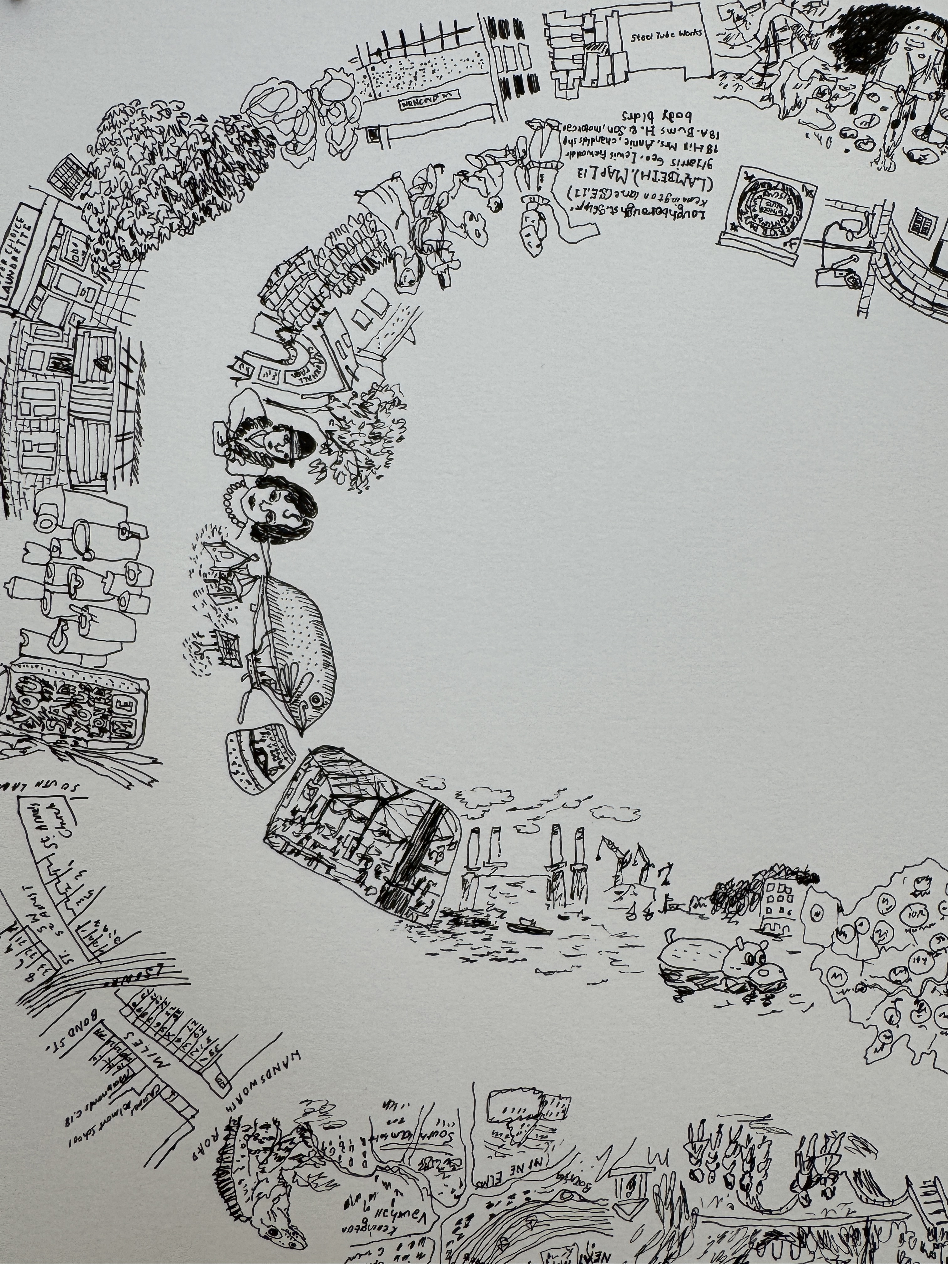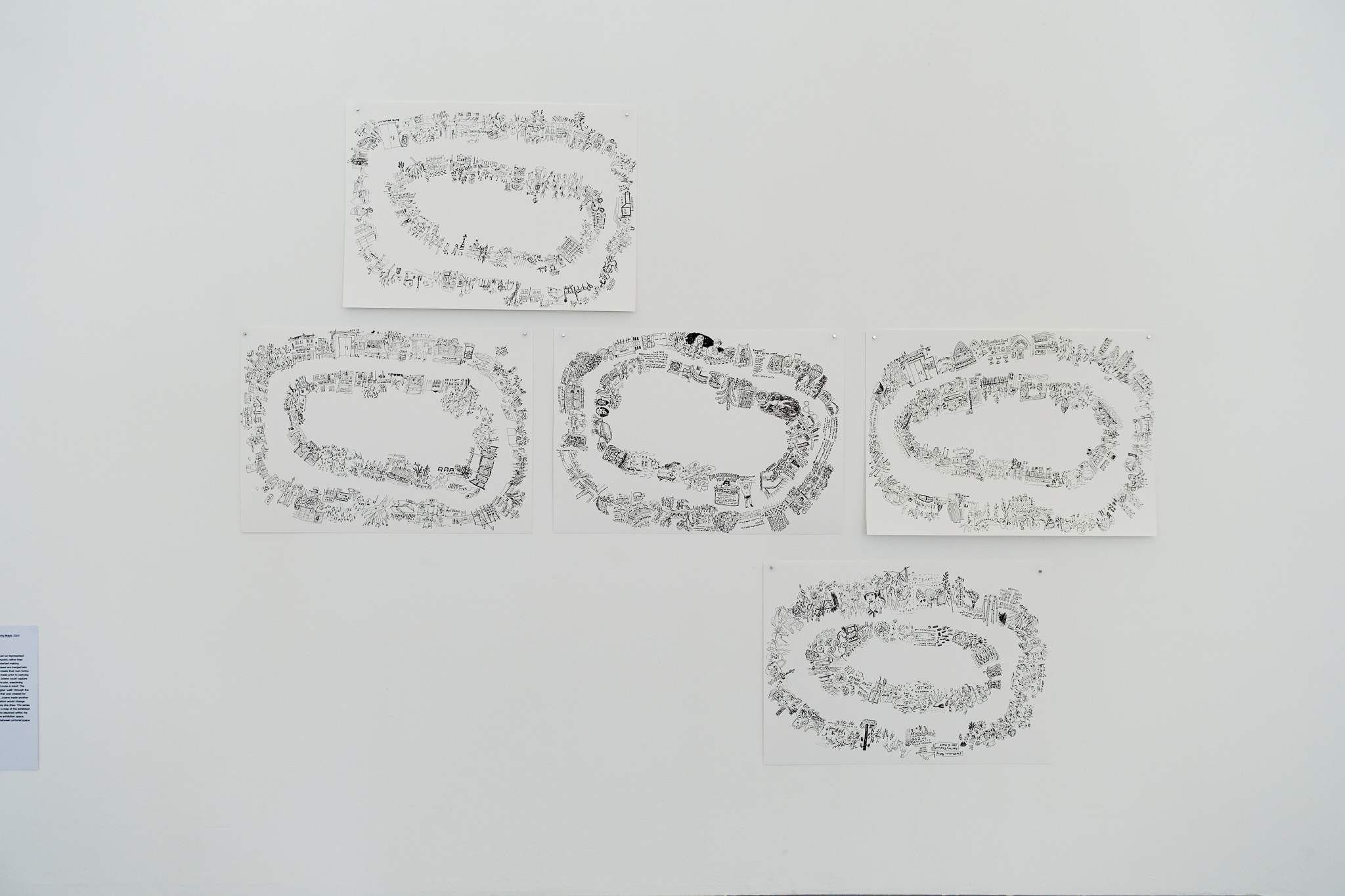 To explore how spaces can be represented from an experiential viewpoint, rather than singular images, Jolene started making walking maps. Multiple views are merged into continuous loops which create their own forms. The first two maps were made prior to carrying out any research so that Jolene could capture her initial responses to the site, wandering intuitively without a fixed route in mind. The third map describes a digital ‘walk’ through the shared research archive that was created for this exhibition. After this, Jolene made another map to see if this information would change where she went or the way she drew. The series concludes (for now) with a map of the exhibition itself, combining elements depicted within the artworks and views of the exhibition space, blurring the boundaries between pictorial space and physical space.