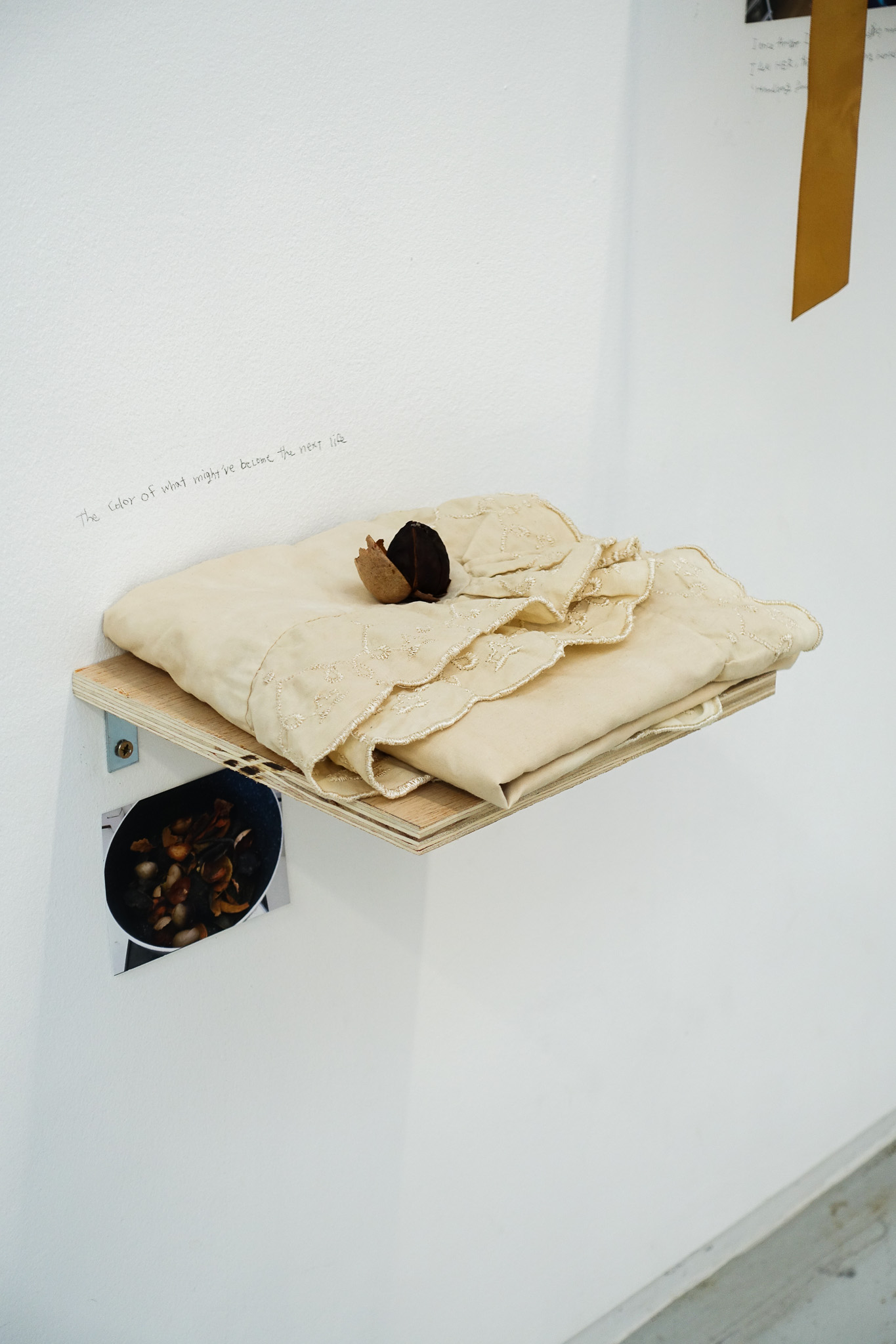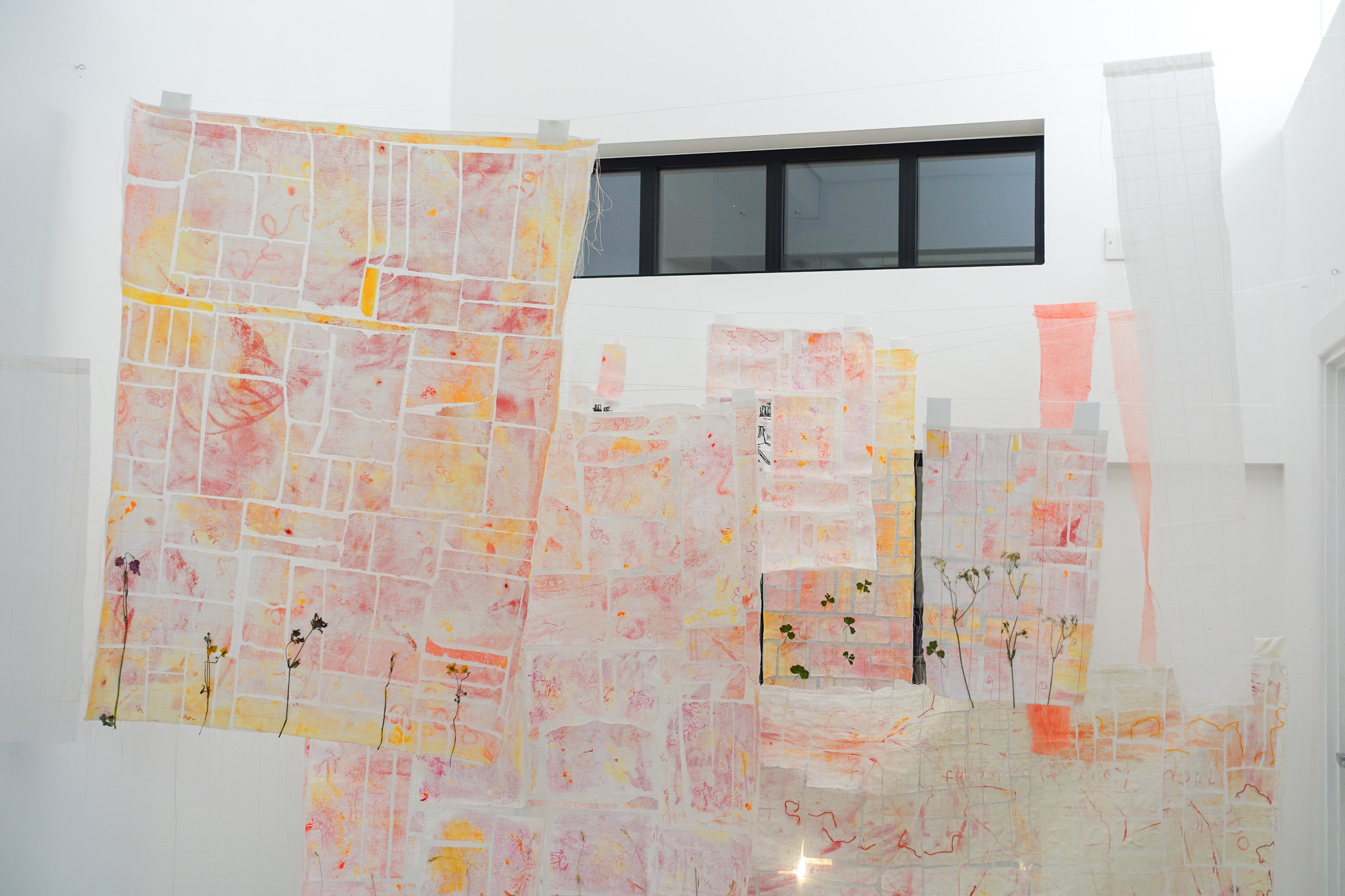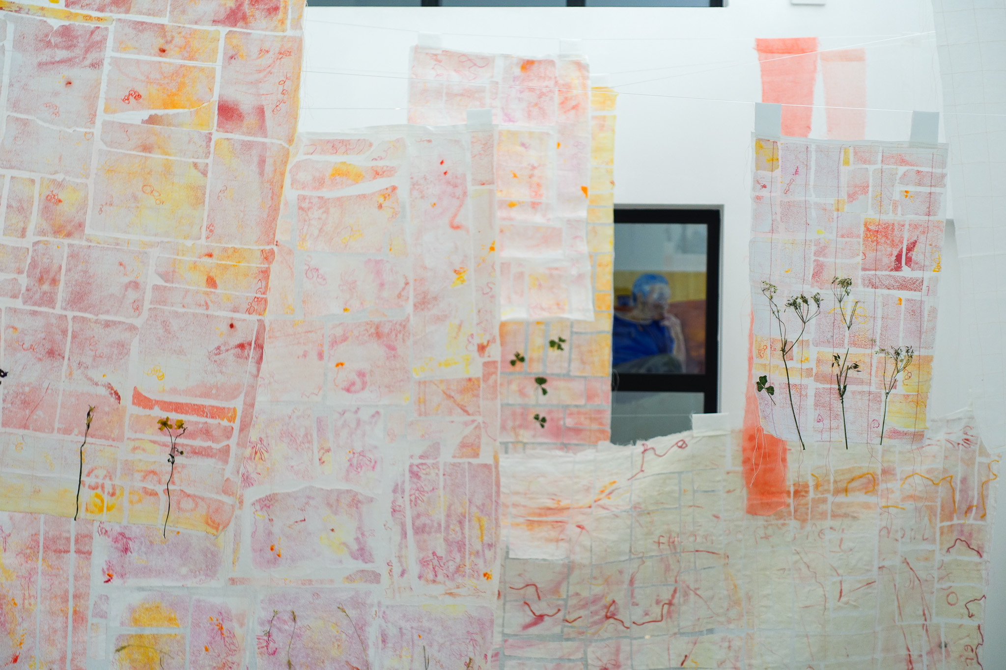hosho paper, ink, thread, cotton organdie, dried flowers
