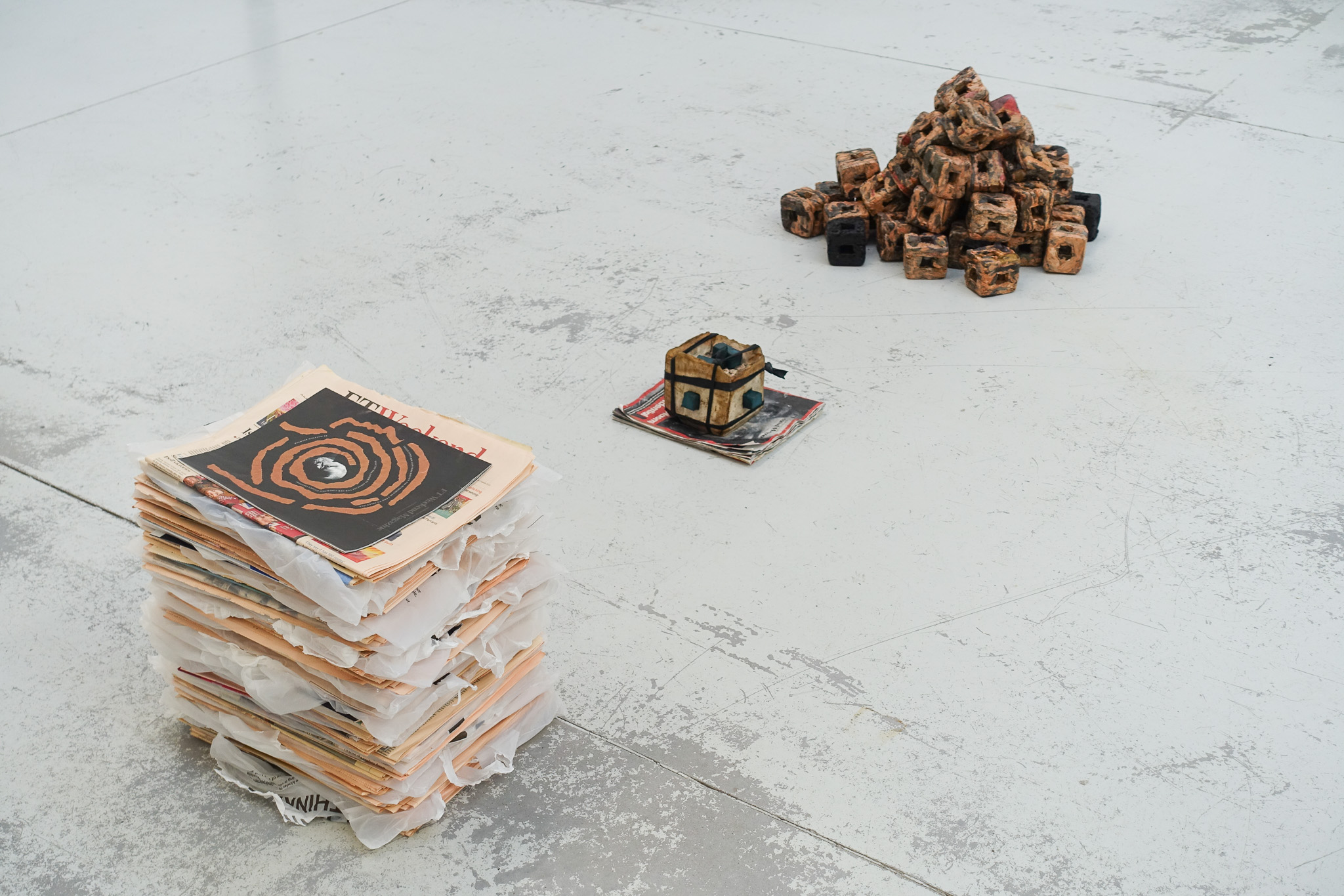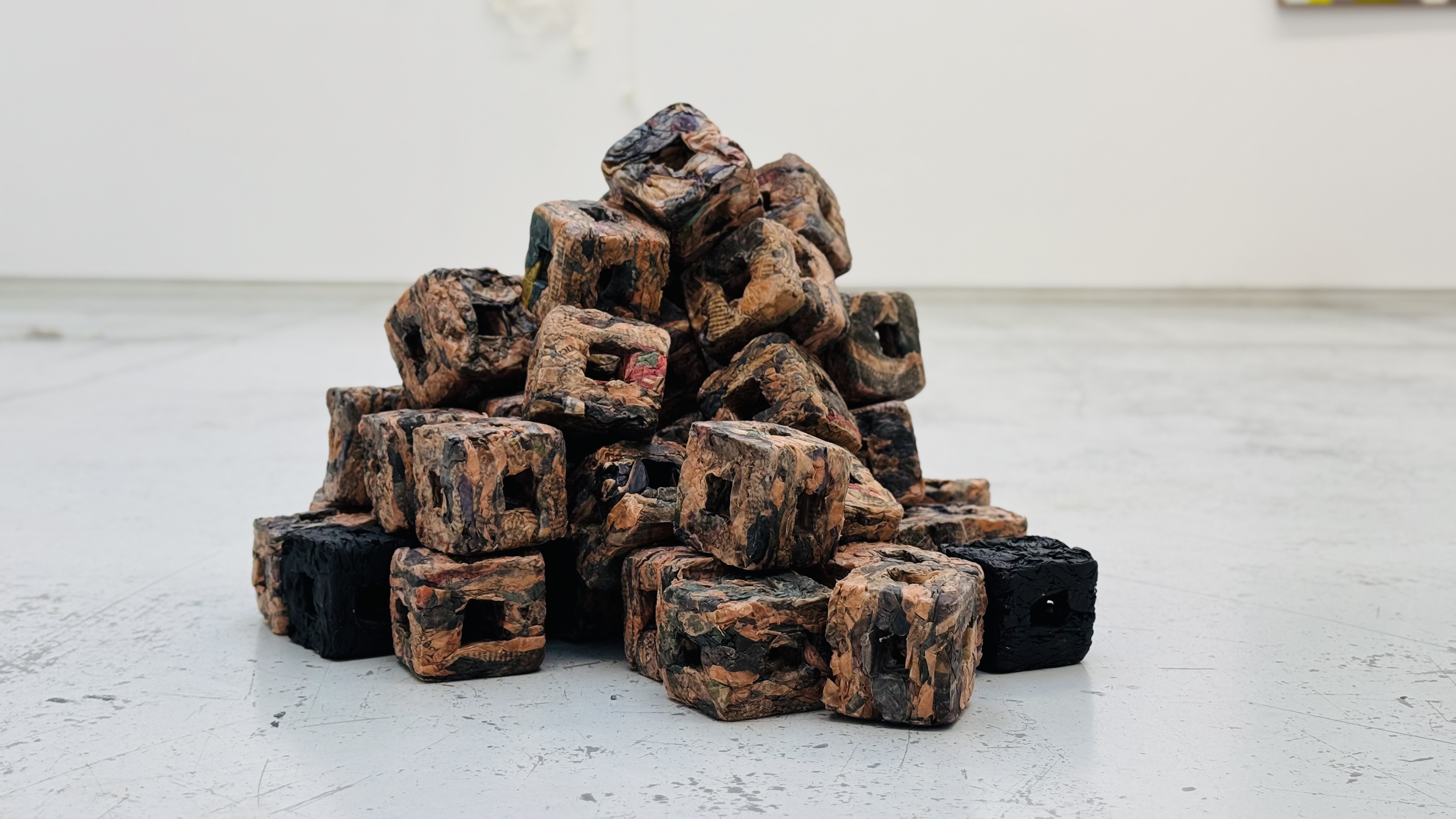 Drawing inspiration from the inherent repetition of factory-based manufacturing and the ubiquitous presence of heaps, stacks, and piles across industrial floors, this installation emerges from an exploration of factory production. Utilising a mould—an enduring emblem of industrial fabrication—nine sheets of discarded newspaper have been cut, rinsed, compressed, dried, and shaped into a humble open cuboid form. This process, methodically repeated over several days and weeks, underscores the mechanical rhythm of the production line, evoking themes of accumulation, standardisation, and waste. The installation encourages viewers to reflect on the invisible hand of societal norms and on the environmental implications of material excess, prompting consideration of how the serial reproduction of even a single object can collectively generate a significant environmental footprint.