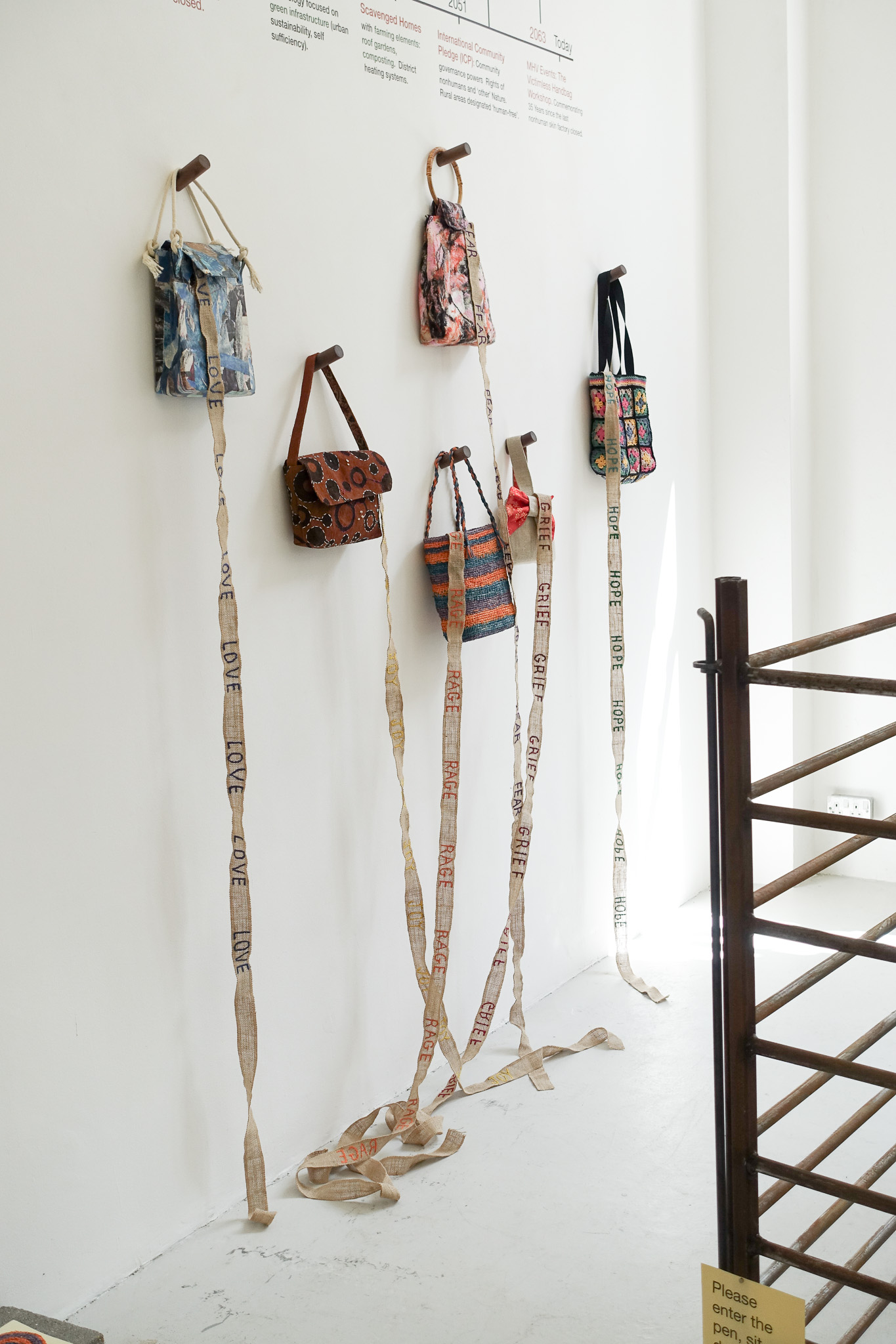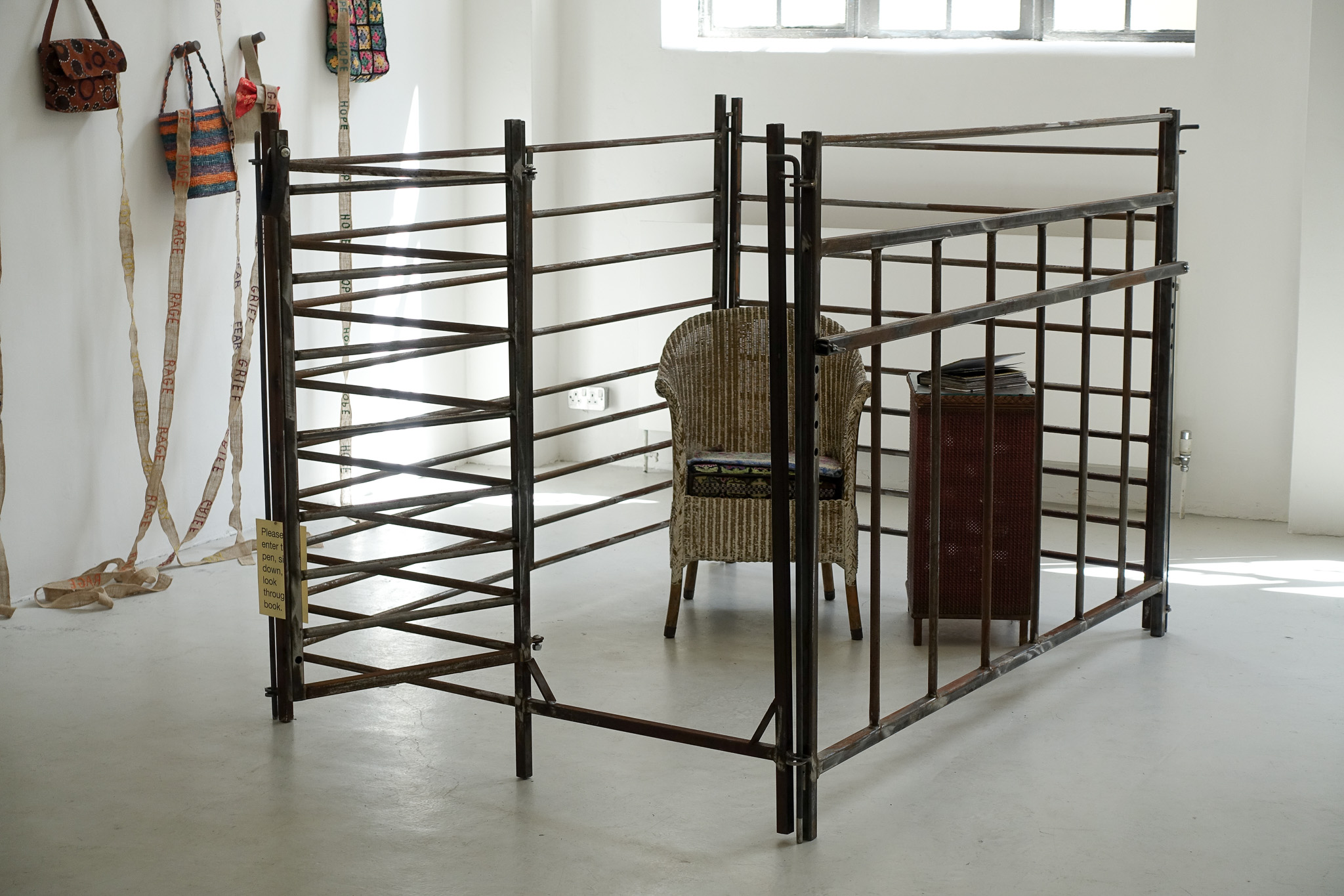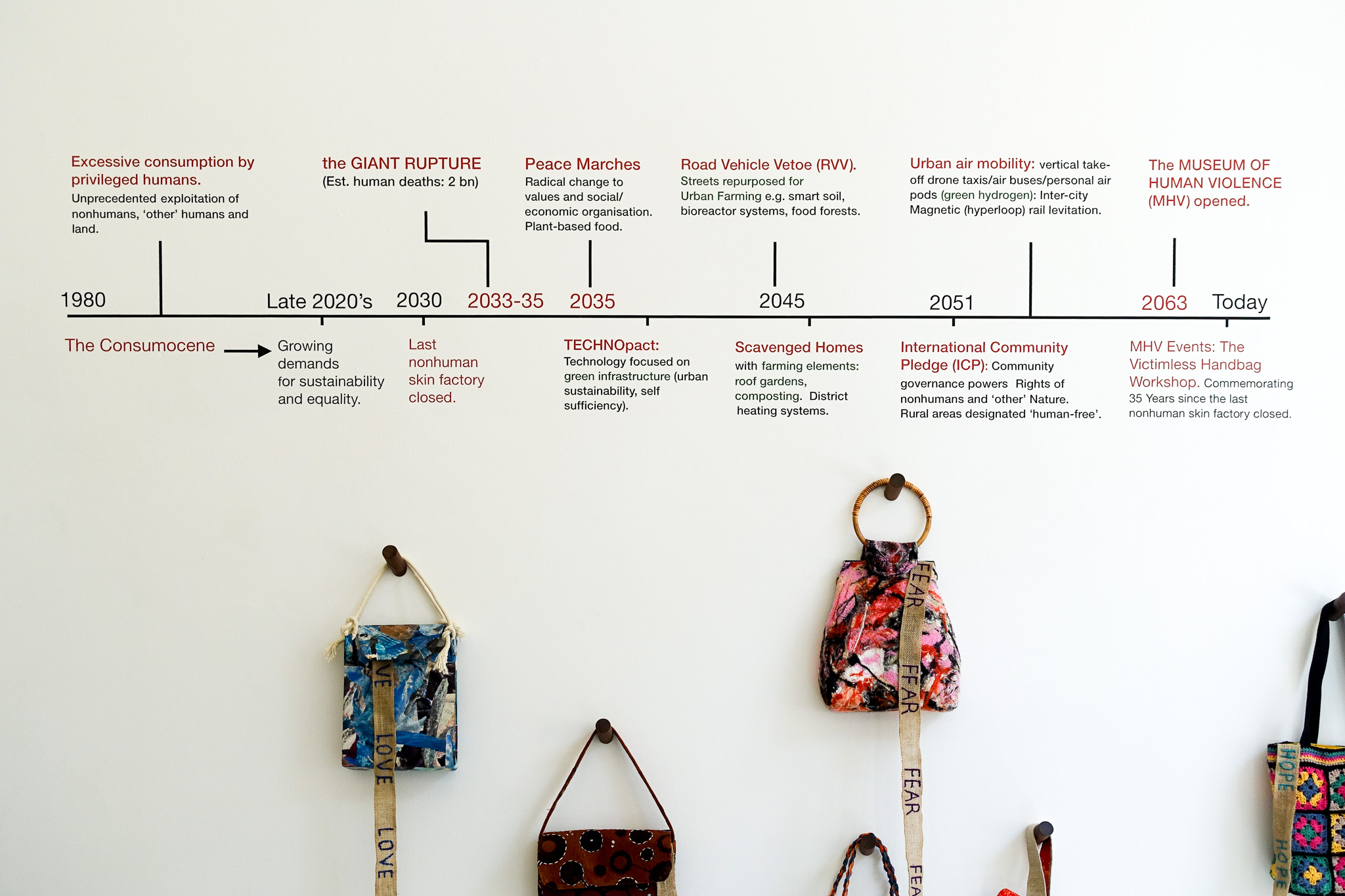 Commissioned by the Museum of Human Violence in 2065, these works commemorate the closing, 35 years ago, of the last handbag factory in the UK using nonhuman skin. The installation is influenced by Heidegger’s belief that the purpose of art is to ‘unconceal’. A steel pen was used pre-Rupture to cage nonhumans, often prior to slaughter. Visitors are invited to sit in the cage and to look inside the ‘coffee table’ book which has been deconstructed to draw attention to excesses of the era, alongside the horrors of the skin industry. Significant events leading from the Consumocene through to our Age of Concord are highlighted in Time-Line. Participants in the Victimless Handbag Workshop, in this fiction, are encouraged to make and use bags metaphorically as ‘holders’ of trauma both pre- and during Rupture.