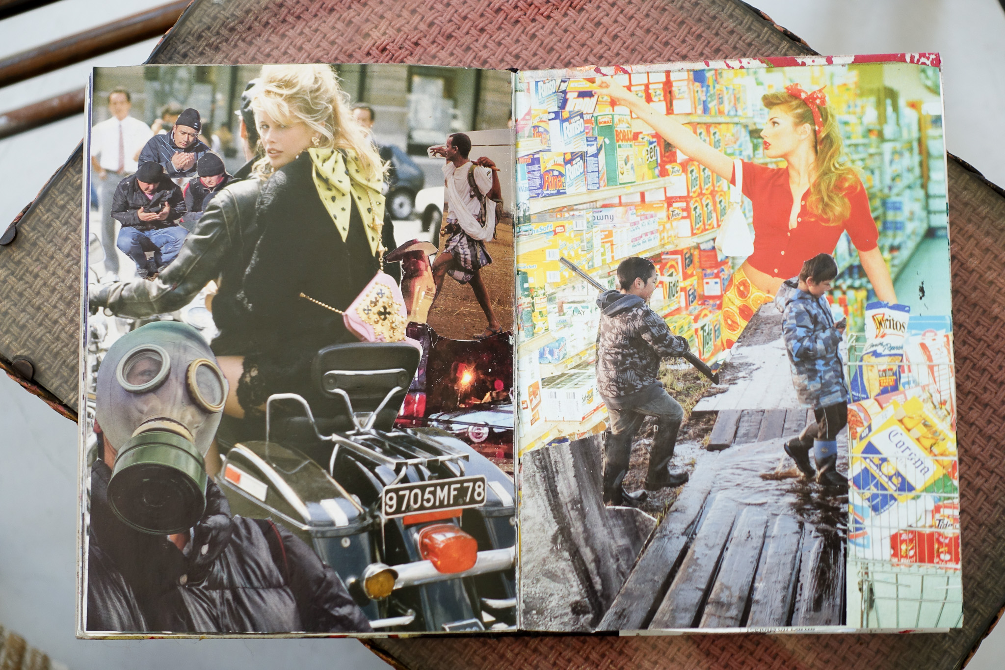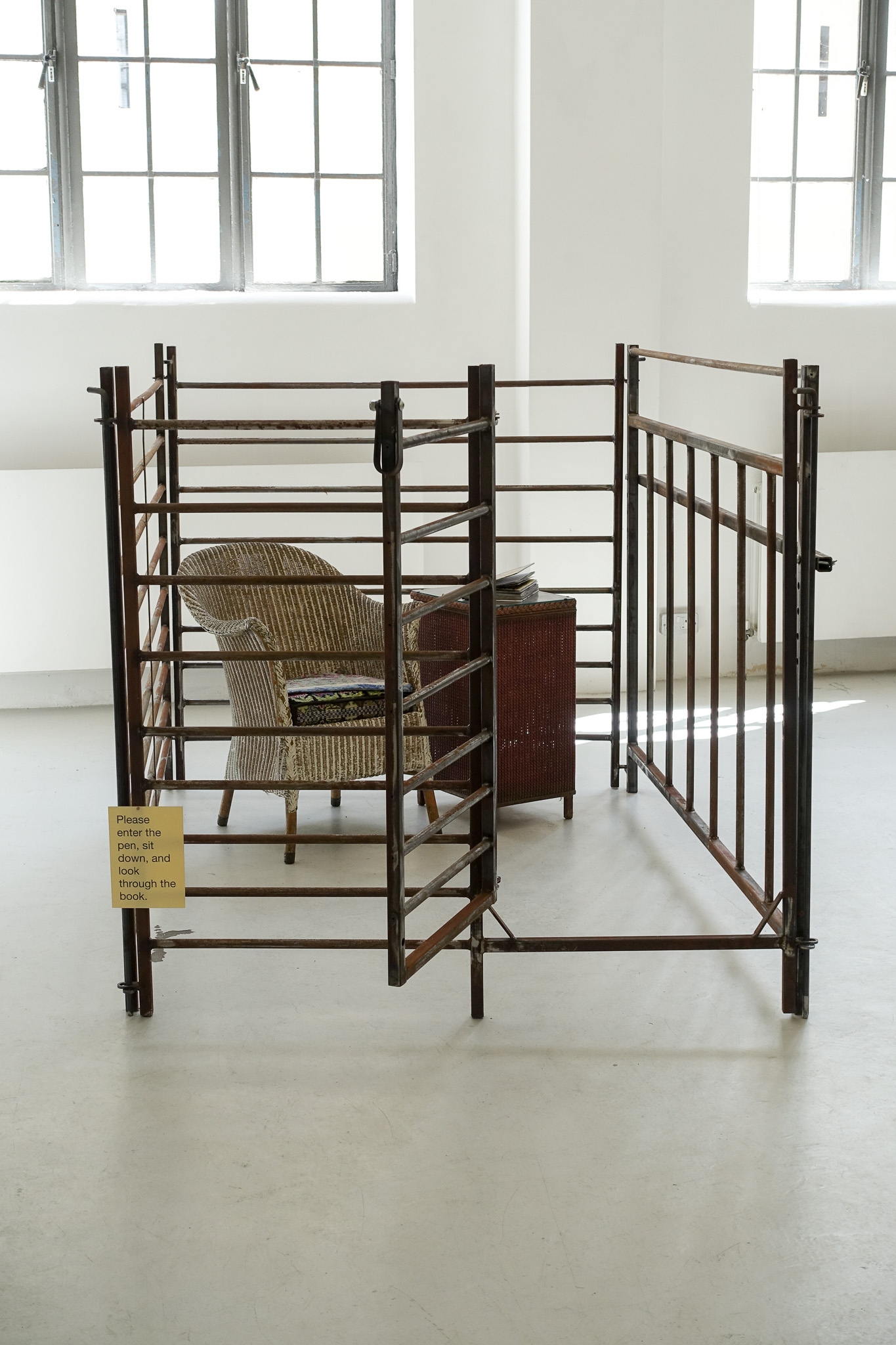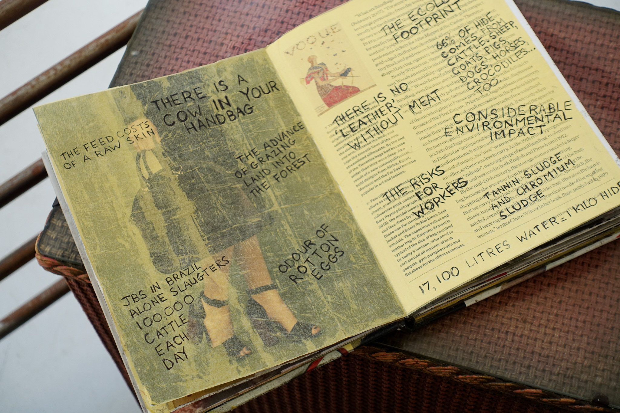 Commissioned by the Museum of Human Violence in 2065, these works commemorate the closing, 35 years ago, of the last handbag factory in the UK using nonhuman skin. The installation is influenced by Heidegger’s belief that the purpose of art is to ‘unconceal’. A steel pen was used pre-Rupture to cage nonhumans, often prior to slaughter. Visitors are invited to sit in the cage and to look inside the ‘coffee table’ book which has been deconstructed to draw attention to excesses of the era, alongside the horrors of the skin industry. Significant events leading from the Consumocene through to our Age of Concord are highlighted in Time-Line. Participants in the Victimless Handbag Workshop, in this fiction, are encouraged to make and use bags metaphorically as ‘holders’ of trauma both pre- and during Rupture.