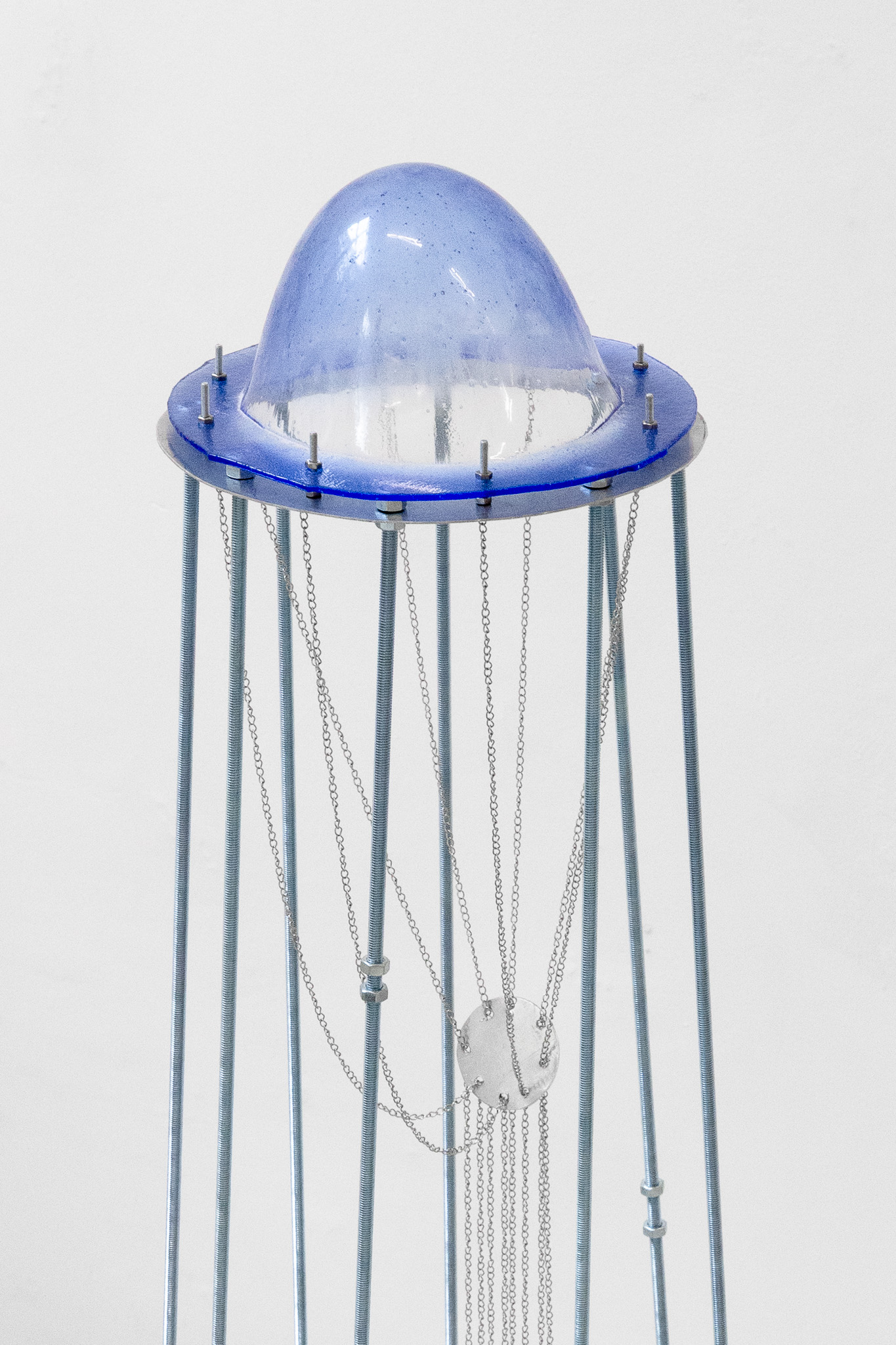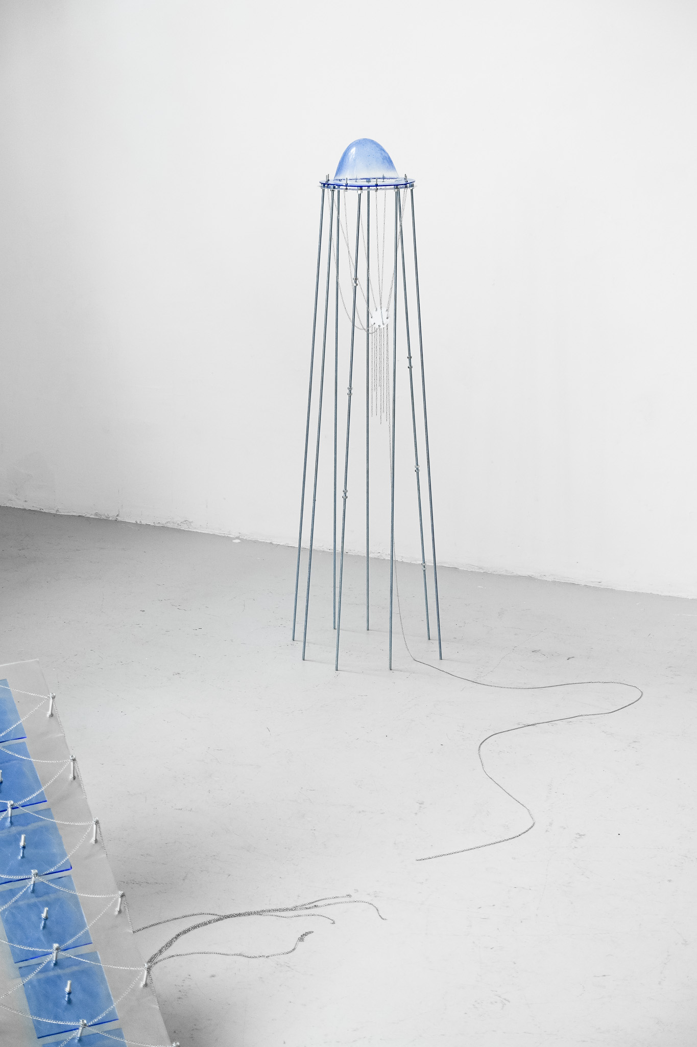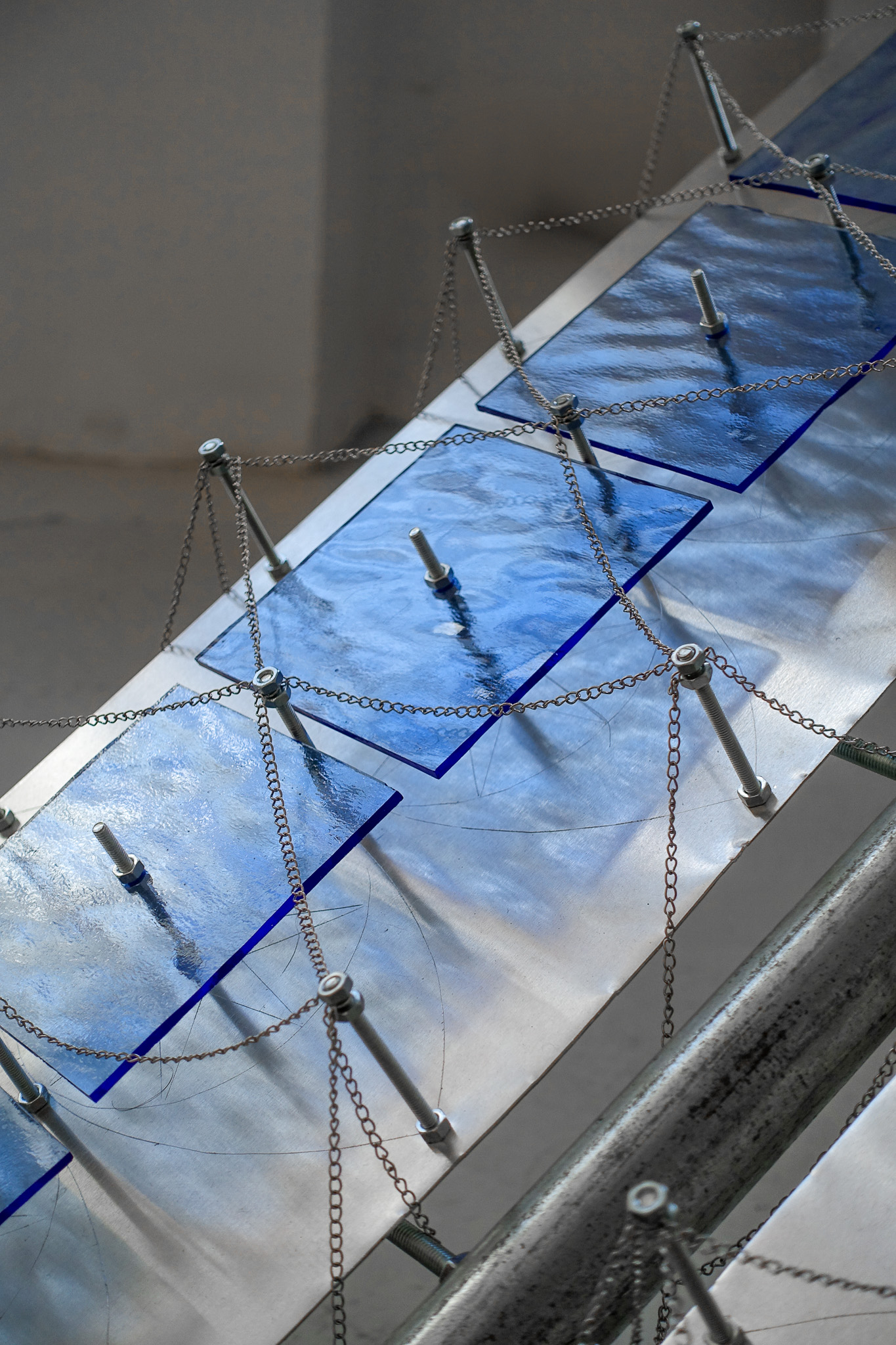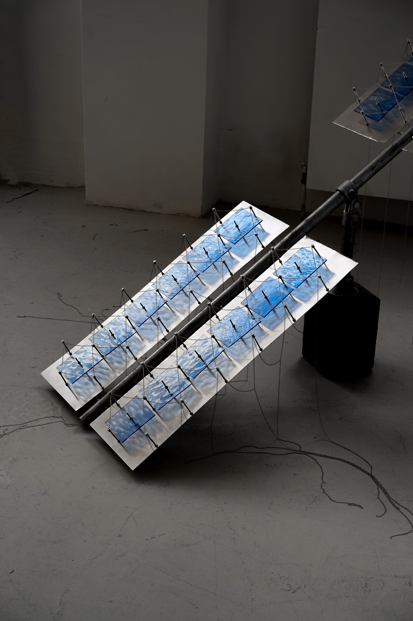 glass, steel, aluminum, chains, breezeblock, 110 x 30cm; 30 x 165 x 165cm